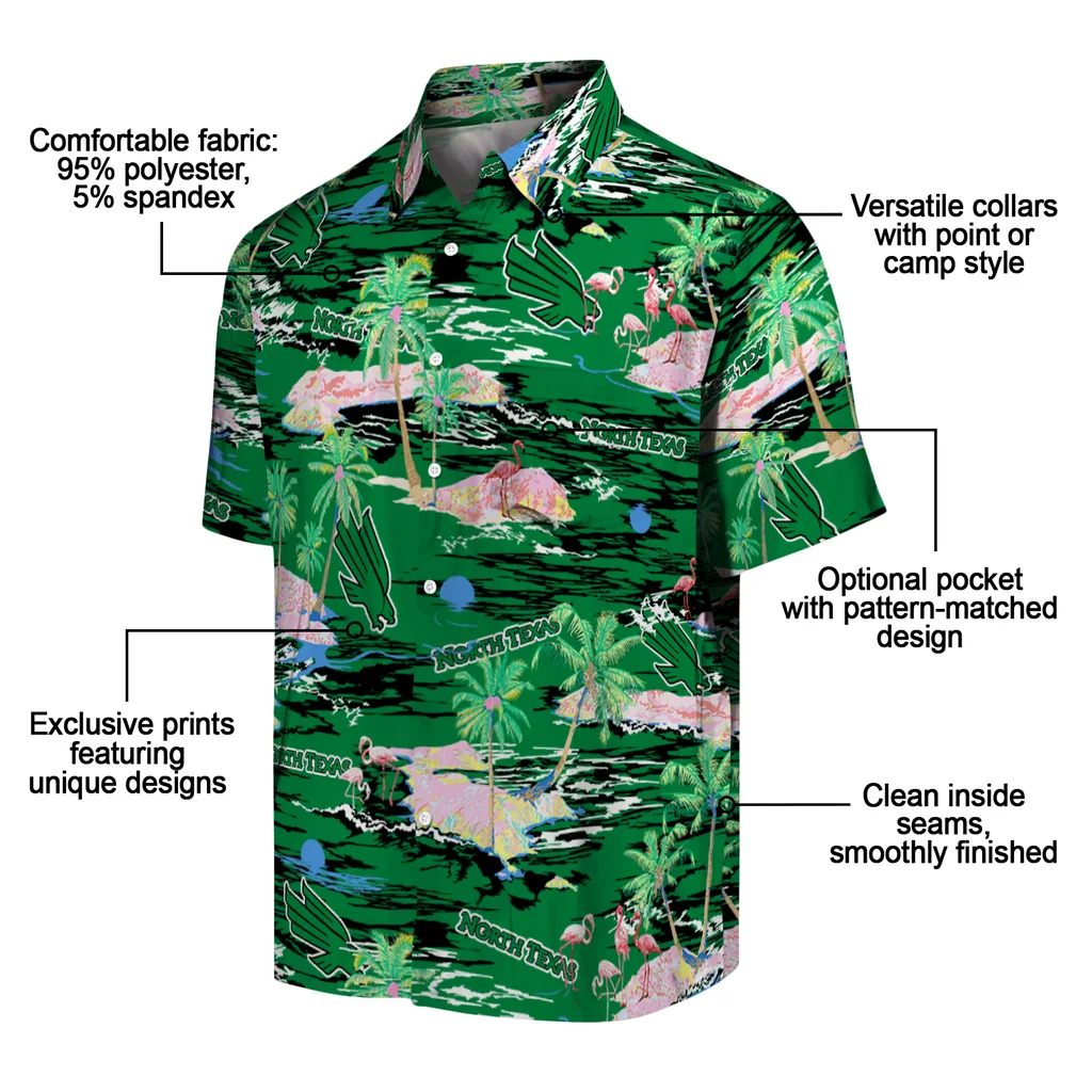 Give a whole new meaning to your wardrobe with North Texas Mean Green Hawaiian Shirt – Tropical Palms from Tapa Aloha Shirt! The various fabrics combined offer extreme breathability for comfort in these vibrant, eye-catching designs that keep things chill in style. Ideal for various occasions, these shirts spell volumes about style and character, all wrapped up in one stunning package.